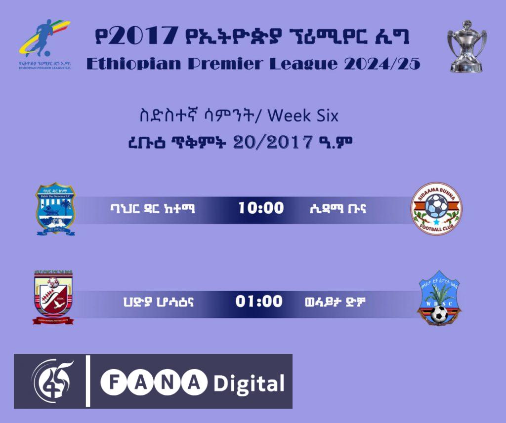 አዲስ አበባ፣ ጥቅምት 20፣ 2017 (ኤፍ ቢ ሲ) በ2017 የኢትዮጵያ ፕሪሚየር ሊግ 6ኛ ሣምንት መርሐ-ግብር ዛሬ ሁለት ጨዋታዎች ይደረጋሉ፡፡