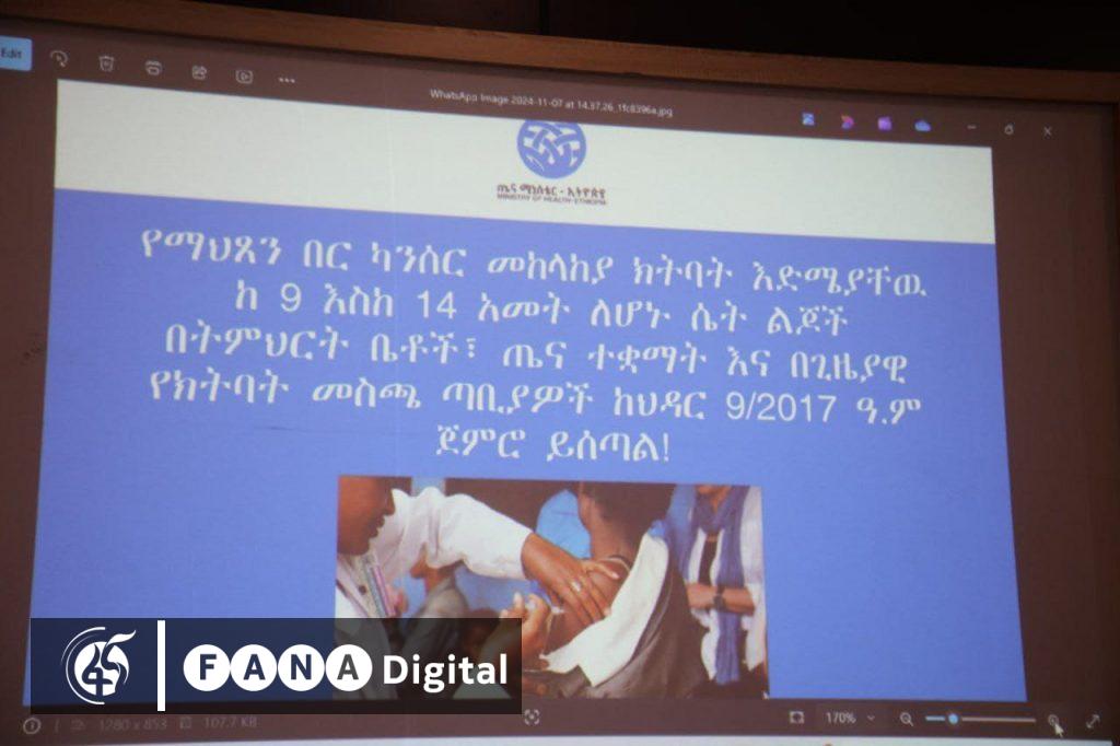 አዲስ አበባ፣ ሕዳር 2፣ 2017 (ኤፍ ቢ ሲ) ከህዳር 9 ቀን 2017 ዓ.ም ጀምሮ እድሜያቸው ከ9 እስከ 14 ዓመት ለሆኑ ሴት ልጆች የማህፀን በር ካንሰር መከላከያ ክትባት ሊሰጥ እንደሆነ ጤና ሚኒስቴር አስታወቀ፡፡