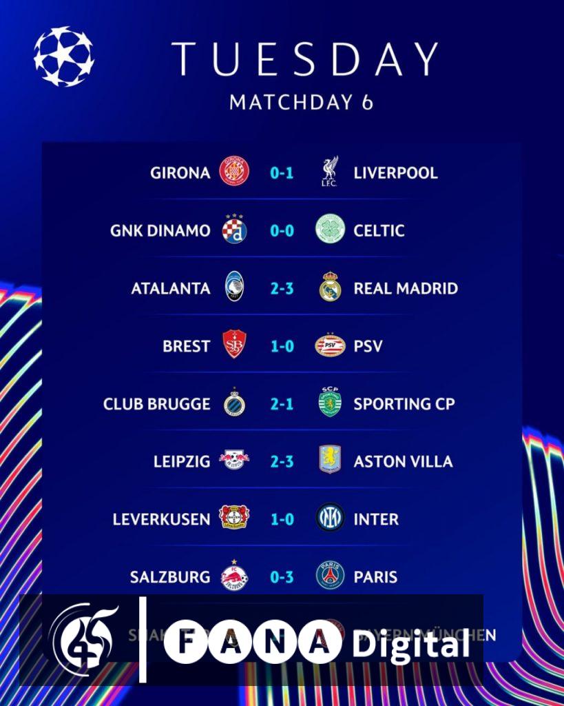 እንዲሁም ሊቨርፑል ዢሮናን 1 ለ 0፣ ባየርሊቨርኩስን ኢንተርሚላንን 1 ለ 0፣ ብረስት ፒኤስቪን 1 ለ 0፣ ክለብ ብሩጅ ስፖርቲንግ ሊዝበንን 2 ለ 1፣ አስቶንቪላ አርቢ ሌብዢግን 3 ለ 2፣ ፒኤስጂ ሬድ ቡል ሳልዝበርግን 3 ለ 0፣ ባየርንሙኒክ ሻክታር ዶኔስክን 5 ለ 1 ሲያሸንፉ÷ ዳይናሞ ዛግሬብ እና ሴልቲክ ያለ ምንም ግብ አቻ ተለያይተዋል፡፡
