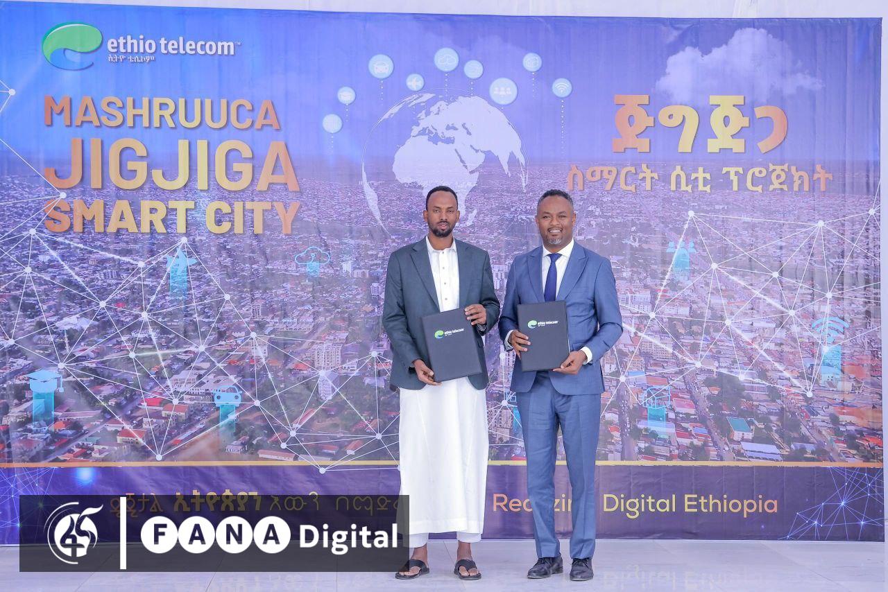 ስምምነቱን የፈረሙት የኢትዮ ቴሌኮም ቺፍ ቴክኖሎጂ ኦፊሰር ታሪኩ ደምሴ እና የጂግጂጋ ከተማ አሥተዳደር ከንቲባ ሻፊ አሕመድ (ኢ/ር) ናቸው፡፡