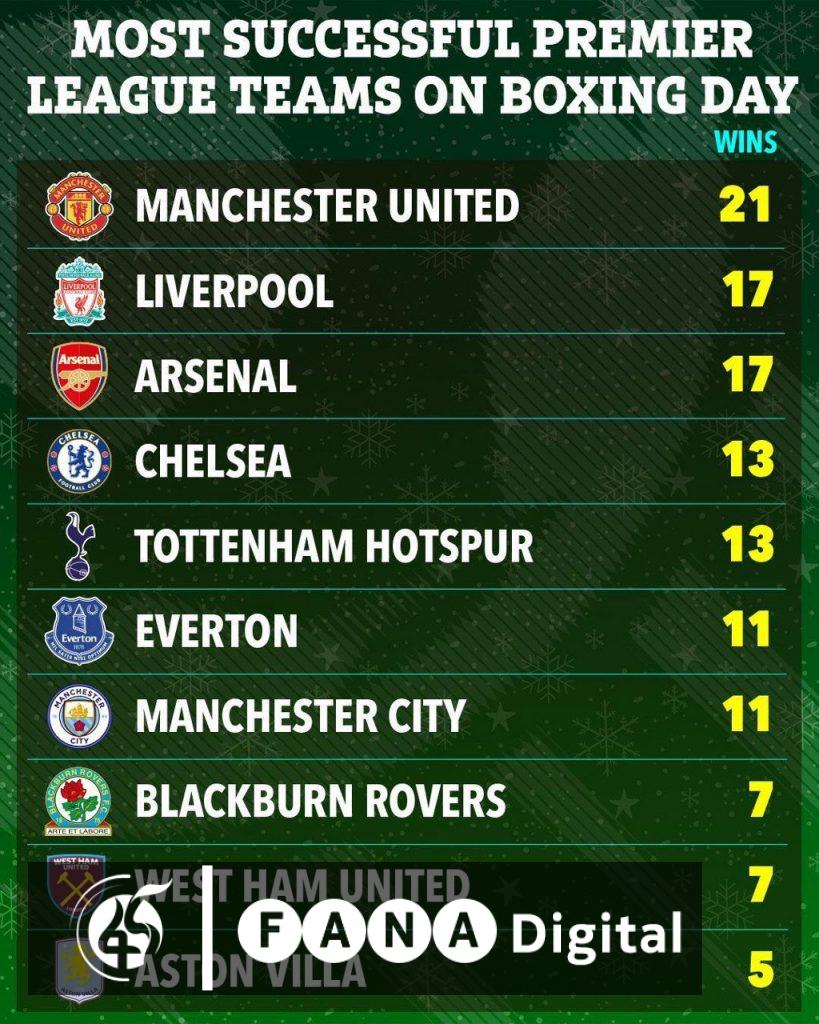 ሊቨርፑል እና አርሰናል 17 ጊዜ የገና በዓል ዋዜማ ጨዋታዎችን በማሸነፍ በሁለተኛ ደረጃ ላይ የተቀመጡ ክለቦች ናቸው፡፡