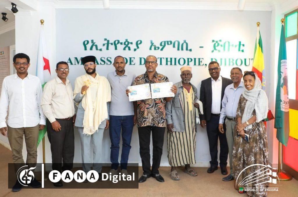 የማህበሩ ሥራ አስፈጻሚ አመራሮች በጅቡቲ የኢትዮጵያ አምባሳደር ብርሃኑ ፀጋዬ በተገኙበት የቦንድ ግዢውን አስረክበዋል።