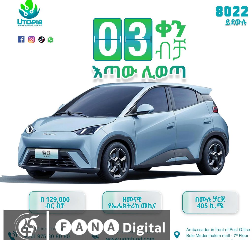 በዘርፉ ፈር ቀዳጅ የሆነው ድርጅታችን ዩቶፒያ ቴክኖሎጂ ሃላ/የተ/የግ/ማ “የዮቶፕያ ግሪን ሞቢሊቲ ፕሮጀክት” (Utopia Green Mobility) አካል የሆነው እና በኢትዮጵያ የመጀመሪያ የሆነውን የመኪና ፍይናንሲንግ ሲስተም “ዮቶፕያ ግሪን ፈንድ” (www.ugmfund.com) በመጠቀም በመኪና ሊዝ ፍይናንሲንግ በዝቅተኛ ቅድመ ክፍያ (900,000 ብር ጀምሮ ) በርካታ ደንበኞችን ዘመናዊ የኤሌክትሪክ መኪና ባለቤት ማድረጉን ቀጥሏል፡፡