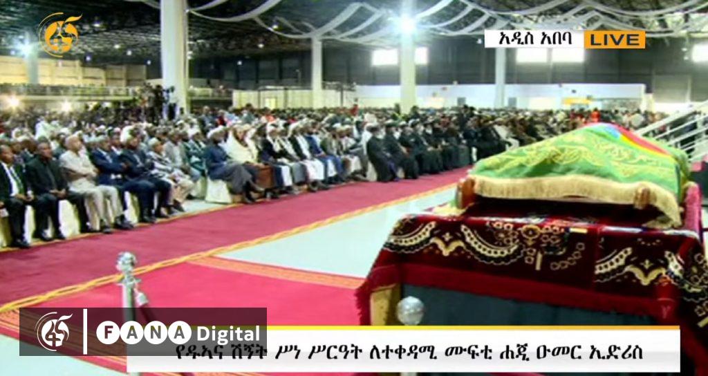 አዲስ አበባ፣ ጥቅምት 10፣ 2018 (ኤፍ ኤም ሲ) ለተቀዳሚ ሙፍቲ ሐጂ ዑመር ኢድሪስ አስከሬን በሚሊኒዬም አዳራሽ የዱዓ እና ሽኝት ሥነ ሥርዓት እየተከናወነ ይገኛል።