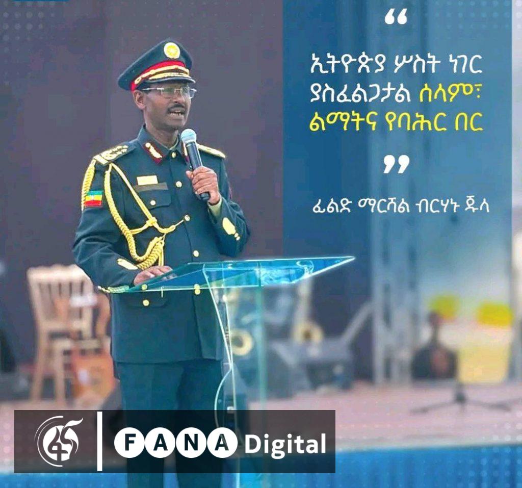ላለፋት 30 ዓመታት ተኝተናል፤ አሁን ግን ላንተኛ እንደሀገር ነቅተናል ያሉት ፊልድ ማርሻል ብርሃኑ ጁላ÷ የሀገራችን የሕልውና ጥያቄ የሆነውን የሰላም ፣ የልማትና የባሕር በር ተጠቃሚነት እናሳካለን ሲሉ አጽንኦት ሰጥተዋል።