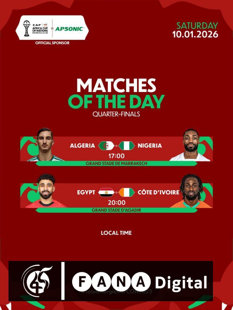 አዲስ አበባ፣ ጥር 2፣ 2018 (ኤፍ ኤም ሲ) በሞሮኮ አስተናጋጅነት እየተካሄደ በሚገኘው የ2025 የአፍሪካ ዋንጫ የሩብ ፍጻሜ ጨዋታዎች አልጄሪያ ከናይጄሪያ እንዲሁም ግብፅ ከኮትዲቯር ይገናኛሉ።