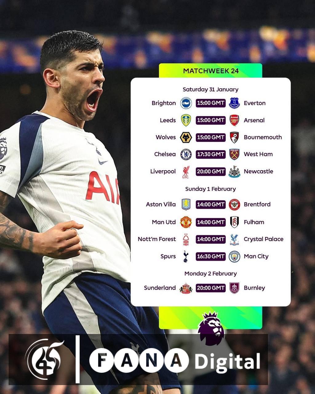 የ24ኛ ሳምንት የእንግሊዝ ፕሪሚየር ሊግ መርሃ ግብር ሰኞ ምሽት 5 ሰዓት ላይ ሰንደርላንድን ከበርንሌይ በማገናኘት ይጠናቀቃል፡፡