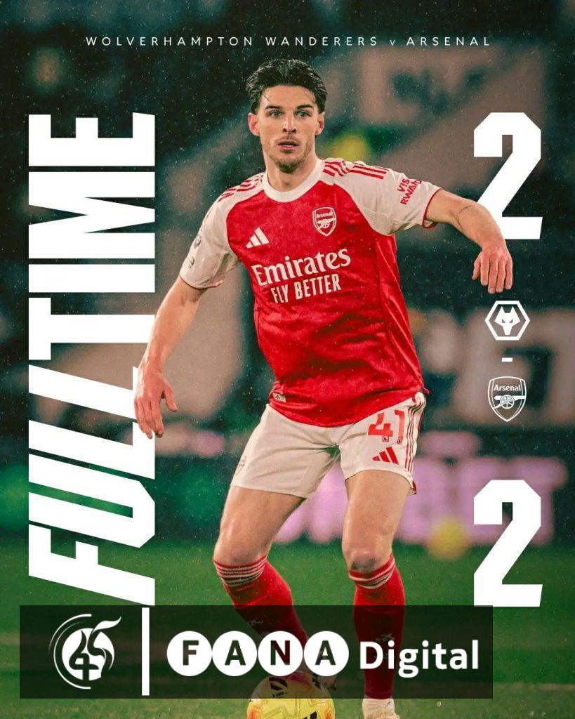 የሊጉ መሪ አርሰናል በቡካዮ ሳካ እና ሂንካፒ ግቦች 2 ለ ዐ ሲመራ ቢቆይም፥ በሊጉ መጨረሻ ደረጃ ላይ ለሚገኘው ዎልቭስ ቡዪኖ እና ካላፊዮሪ (በራሱ ላይ) ባስቆጠሯቸው ግቦች ሁለቱ ቡድኖች ነጥብ ተጋርተዋል።