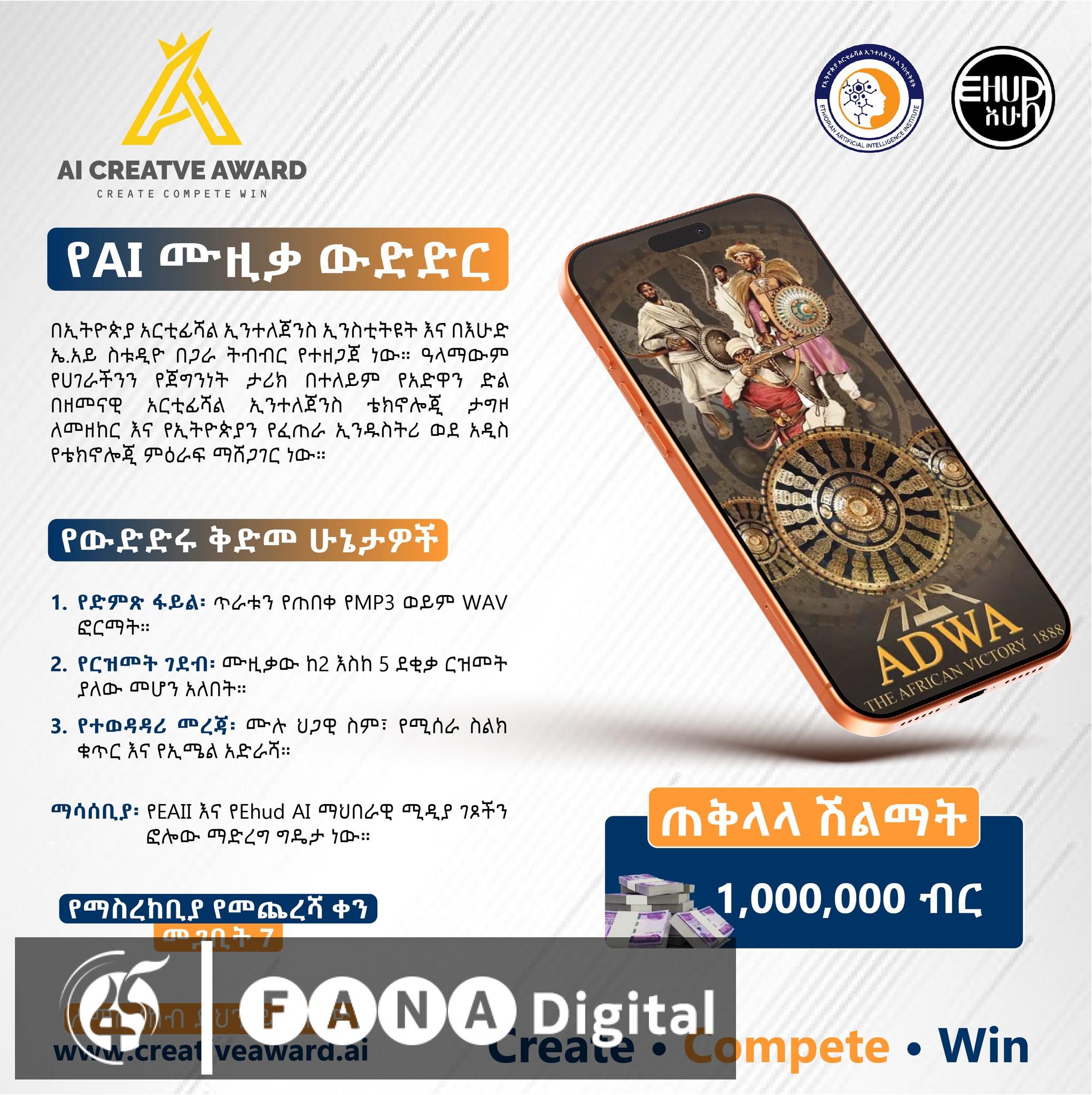 ተቋማቱ ባደረጉት ትብብር መሰረት አንድ ሚሊየን ብር ሽልማት የሚያስገኝ የአርቲፊሻል ኢንተለጀንስ የሙዚቃ ውድድር ያካሂዳሉ።
