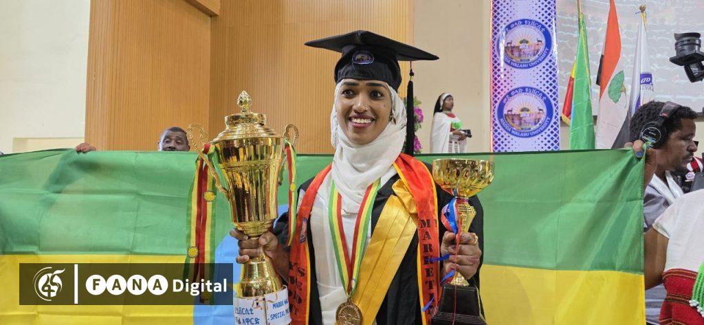 መደ ወላቡ ዩኒቨርሲቲ ዛሬ ካስመረቃቸው ከ1 ሺህ 600 በላይ ተማሪዎች ውስጥ ከፍተኛ ውጤት በማምጣት ሊና የሜዳሊያ እና የሁለት ዋንጫ ተሸላሚ ሆናለች።