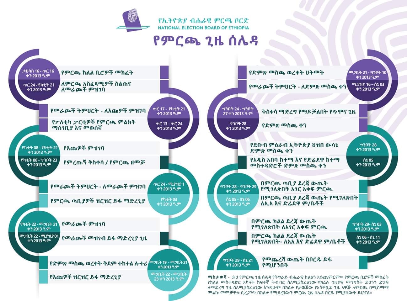 በዚሀም መሰረት የመጨረሻው የጊዜ ሰሌዳ እንደሚከተለው ይፋ ያደረገ ሲሆን ቦርዱ በዚሁ የጊዜ ሰሌዳ መሰረት ተግባራቱ አፈጻጸም ያሉበትን ሁኔታ እንደሚያሳውቅ ከኢትዮጵያ ምርጫ ቦርድ ያገኘነው መረጃ ያመላክታል፡፡
