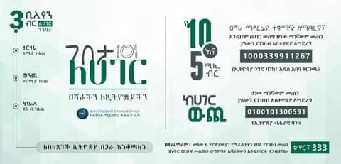 ሌሎች ተሳታፊ ተቋማትም የ5 እና የ10 ሚሊየን ብር አስተዋጾአቸውን ባንክ ያስገቡበትን ደረሰኝ በdineforethiopia@pmo.gov.et መላክ እንደሚችሉ የጠ/ሚ ጽ/ቤት አስታውቋል ።