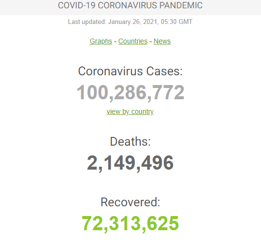 አዲስ አበባ፣ ጥር 18፣ 2013(ኤፍ ቢ ሲ)በአለም ዙሪያ በኮሮናቫይረስ የተያዙ ሰዎች ቁጥር 100 ሚሊየን ማለፉ ተሰምቷል፡፡
