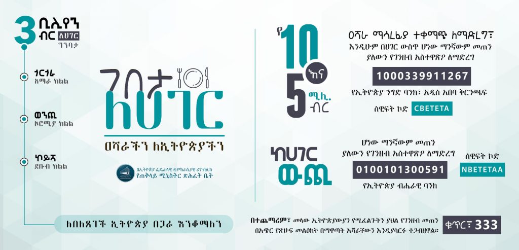 ሌሎች ተሳታፊ ተቋማትም የ5 እና የ10 ሚሊየን ብር አስተዋጾአቸውን ባንክ ያስገቡበትን ደረሰኝ በdineforethiopia@pmo.gov.et እንዲያደርሱ ጥሪ ቀርቧል።