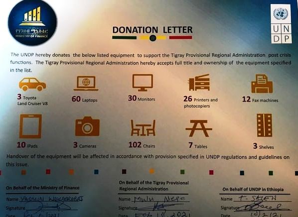 አዲስ አበባ ፣ የካቲት 4 ፣ 2013 (ኤፍ ቢ ሲ) በተባበሩት መንግስታት የልማት ፕሮግራም ለትግራይ ጊዜያዊ አስተዳደር የተሽከርካሪ፣ የቢሮ እና የፅህፈት መሳሪያዎች እንዲሁም የተለያዩ መሳሪያዎችን ድጋፍ አደረገ፡፡