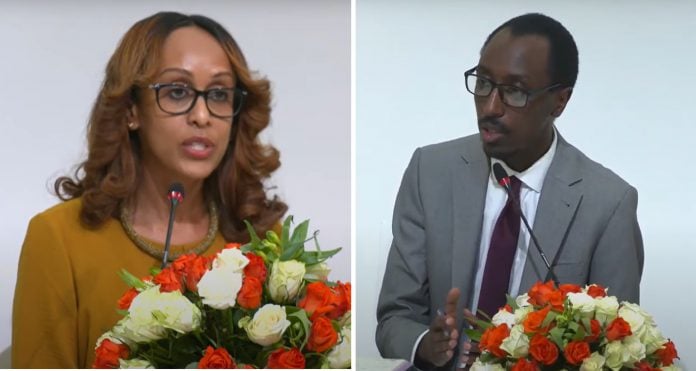 የፌዴራል ጠቅላይ ዐቃቤ ህግ ዶክተር ጌዲዮን ጢሞቴዎስ ከጠቅላይ ሚኒስትር ጽህፈት ቤት የውጭ ቋንቋዎችና ዲጂታል ሚዲያ ኃላፊ ቢልለኔ ስዩም ጋር በመሆን በሃገር ውስጥ ለሚገኙ የውጭ መገናኛ ብዙሃን ጋዜጠኞች መግለጫ ሰጥተዋል።