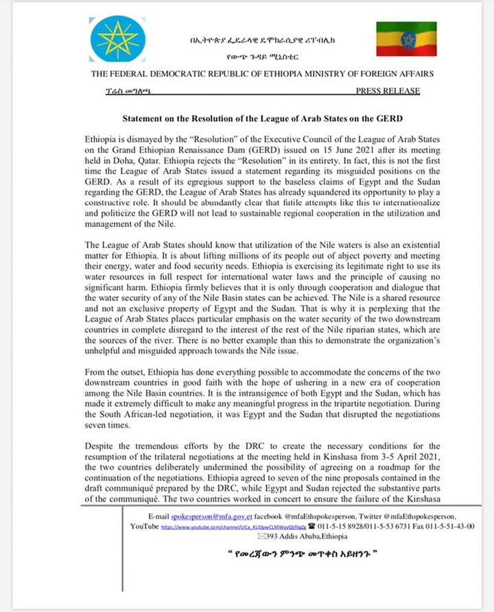 የግብጽ እና የሱዳንን ቅሬታ ተቀብሎ ገምቢ ሚና ይጫወታል በሚል ሊጎ ቢጠበቅም፣ ውጤት አልባ እንዲሆን አድርጎታል ይላል መግለጫው፡፡
