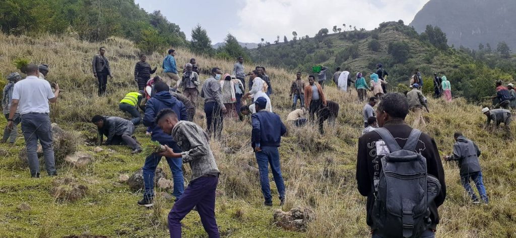 አዲስ አበባ ፣ ሐምሌ 1 ፣ 2013 (ኤፍ ቢ ሲ) የባህልና ቱሪዝም ሚኒስቴርና ተጠሪ ተቋማት የተውጣጡ ሰራተኞች በበጋው ወቅት የእሳት አደጋ በደረሰበት የወፍ ዋሻ ደን ችግኝ ተከሉ።