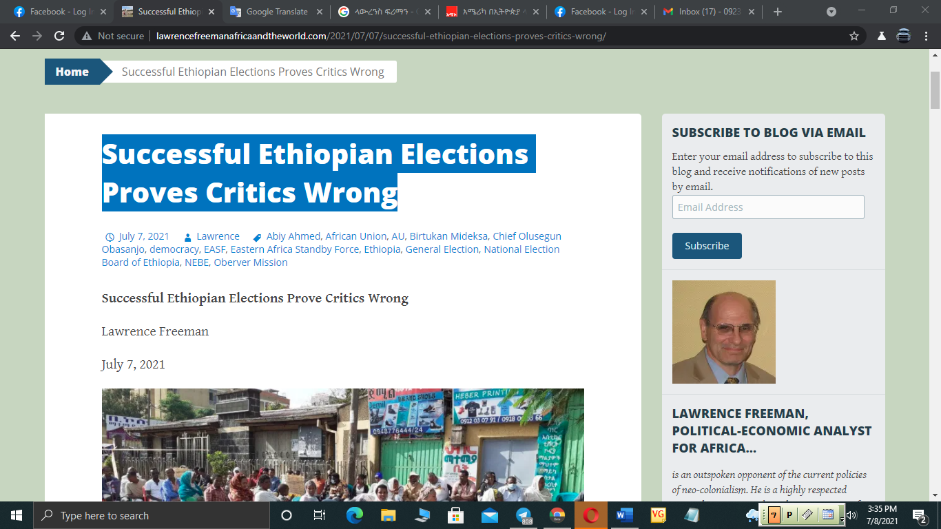 አዲስ አበባ ፣ ሐምሌ 1 ፣ 2013 (ኤፍ ቢ ሲ) ኢትዮጵያ ያካሄደችው ስድስተኛው ዙር ጠቅላላ ምርጫ ስኬታማ መሆን በኢትዮጵያ ላይ ትችት የሚያቀርቡ አከላት የተሳሳቱ መሆናቸውን ያረጋግጣል ሲሉ የፖለቲካና ኢኮኖሚ ተንታኙ ላውረንስ ፍሪማን ገለጹ።