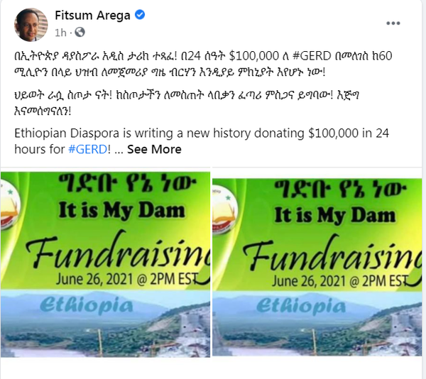 በአሜሪካ የኢትዮጵያ አምባሳደር ፍጹም አረጋ በማህበራዊ ትስስር ገጻቸው፥ አዲስ ታሪክ ተጻፈ ሲሉ ለግድቡ በ24 ሰዓት 100ሺህ የአሜሪካ ዶላር መሰብሰቡን ገልጸዋል፡፡