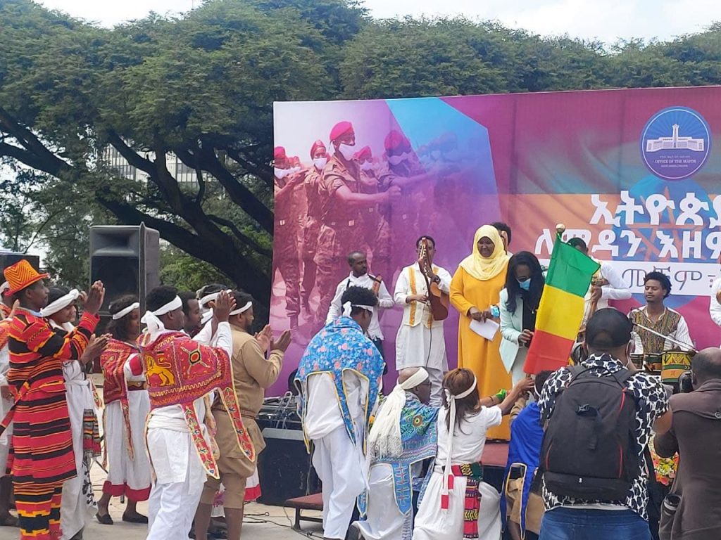 አዲስ አበባ፣ ነሃሴ 7፣ 2013 (ኤፍ ቢ ሲ) ለመከላከያ ሠራዊት ድጋፍ ለሚሰጡ የኪነጥበብ ባለሙያዎች በአዲስ አበባ ከተማ መስተዳድር ማዘጋጃ ቤት የሽኝት ሥነ-ሥርዓት እየተካሄደ ነው።