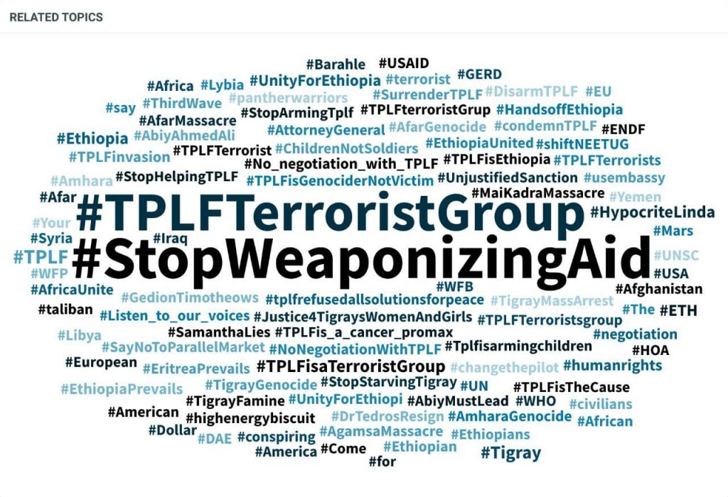 ”በእርዳታ ሽፋን የሚደረግ የጦር መሳሪያ ማስታጠቅ ይቁም!” የተሰኘው መፈክር ትላንት ምሽት ጀምሮ እስከ ዛሬ ረፋድ ብቻ 105 ሺህ ትዊቶች ተሰራጭውበታል።