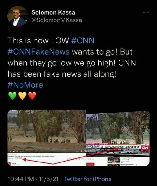 የቴክኖሎጂ አማካሪና ስትራቴጂስት የሆነው የቴክቶክ ዋና አዘጋጅ ሰሎሞን ካሳ በማህበራዊ ትስስር ገጹ ይፋ እንዳደረገው፥ ሲ ኤን ኤን በኢትዮጵያ ስላለው ግጭት በሰራው አንድ ዘገባ ላይ ሀሰተኛ ምስል መጠቀሙን አጋልጧል።