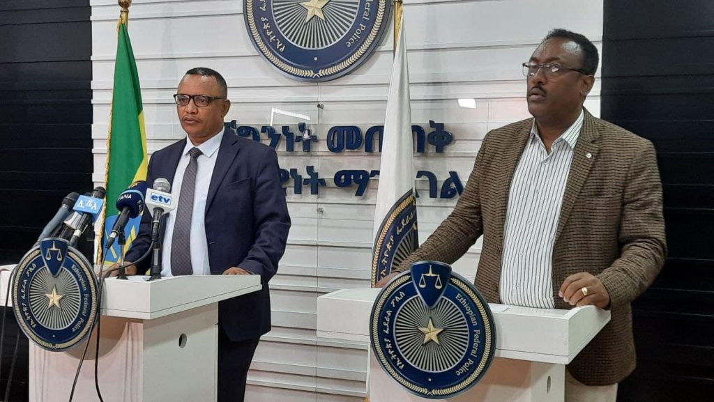 የፌደራል ፖሊስ የወንጀል መከላከል ዘርፍ ሃላፊ ምክትል ኮሚሽነር ጀነራል መላኩ ፈንታና የአዲስ አበባ ፓሊስ ኮሚሽነር ጌቱ አርጋው በአስቸኳይ ጊዜ አዋጁ መሰረት በወንጀል መከላከልና ምርመራ ረገድ በተሰሩ ተግባራትና በተካሄደው ኦፕሬሽን ዙሪያ መግለጫን እየሰጡ ነው።