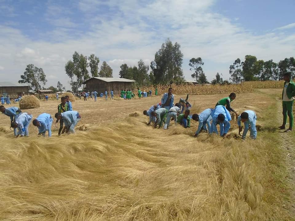 የደጀን ወረዳ ተማሪዎች ወደ ግንባር የዘመቱ የሚሊሻ ቤተሰቦችን ሰብል ሰበሰቡ