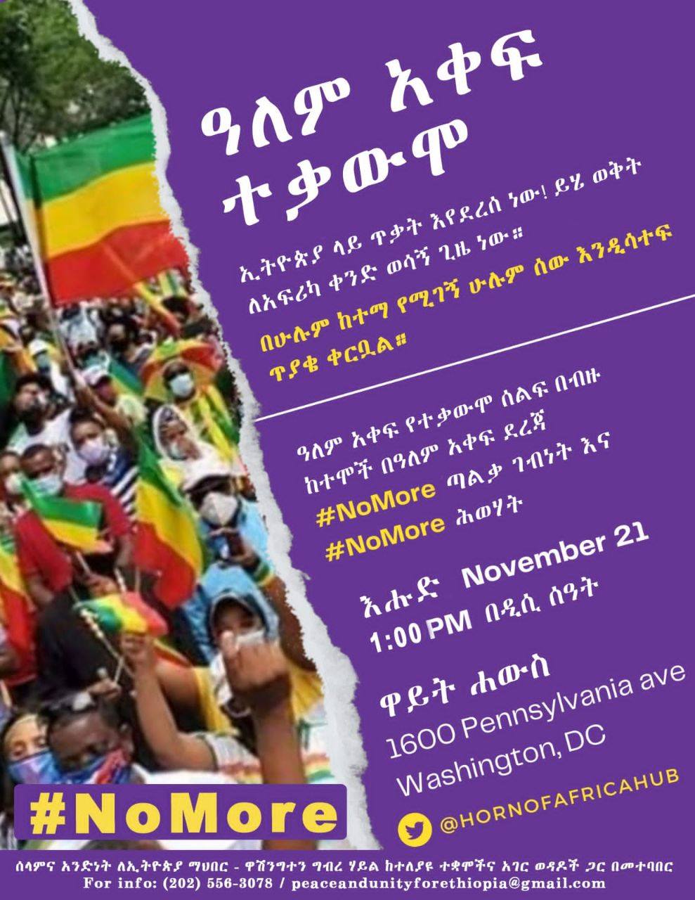 ሕዳር 12 ቀን 2014 ዓ.ም የሚካሄደውን ሰላማዊ ሰልፍ ሰላምና አንድነት ማህበር የዋሺንግተን ዲሲ ግብረ ሃይል፣የ#NoMore የትዊተር ዘመቻ እንቅስቃሴ አስተባባሪዎች፣የተለያዩ ተቋማትና አገር ወዳድ ወዳጆች በጋራ እንዳዘጋጁት ተገልጿል።