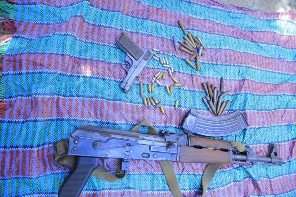 ፖሊስ በተጠቀሰው አካባቢ በሚገኝ አንድ መኖሪያ ቤት ባደረገው ብርበራ አንድ ክላሽንኮቭ ጠብመንጃ ከ28 መሰል ጥይት ጋር እንዲሁም አንድ ሽጉጥ ከመሰል 28 ጥይት ጋር መሬት ውስጥ ተቆፍረው ከተደበቁበት ሊያገኛቸው ችሏል፡፡