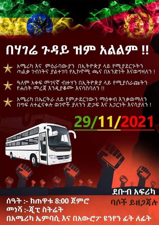 ሰኞ ሕዳር 20 ቀን 2014 ዓ.ም በደቡብ አፍሪካ ፕሪቶሪያ ከተማ የሚካሄደው ሰላማዊ ሰልፍ አስተባባሪዎች አንዱ የሆነው የአፍሪካ ዳያስፖራ ፎረም ከ35 የአፍሪካ አገራት የተወጣጡ ዳያስፖራዎችን ያቀፈ ድርጅት ነው።