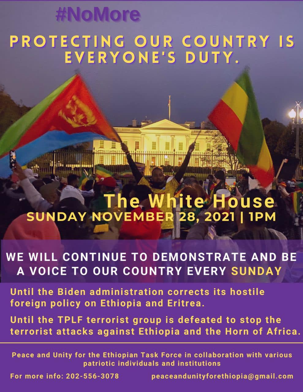 ሰላማዊ ሰልፉ የባይደን አስተዳደር በኢትዮጵያና ኤርትራ ላይ እየተከተለ ያለውን የተሳተተ የውጪ ጉዳይ ፖሊሲ እንዲያስተክልና ጣልቃ ገብነቱን እንዲያቆም በሰልፈኞቹ መልዕክት እንደሚተላለፍ ተገልጿል።