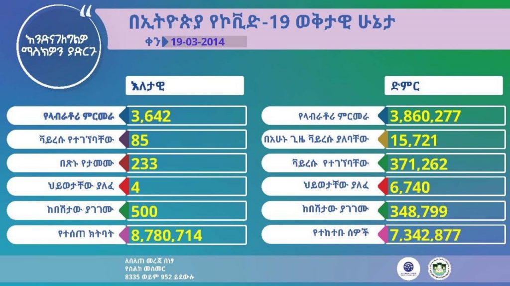 አዲስ አበባ፣ ህዳር 19፣ 2014 (ኤፍ ቢ ሲ) በኢትዮጵያ ባለፉት 24 ሰዓታት ለ3 ሺህ 642 ዜጎች በተደረገ የላቦራቶሪ ምርመራ 85 ሰዎች የኮሮና ቫይረስ እንደተገኘባቸው የጤና ሚኒስቴር አስታውቋል፡፡