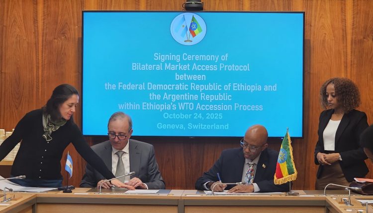 Addis Ababa, October 24, 2025 (FMC) — Ethiopia and Argentina signed a Bilateral Market Access Protocol today at the World Trade Organization (WTO) headquarters in Geneva, marking a major step forward in Ethiopia’s bid for WTO membership.