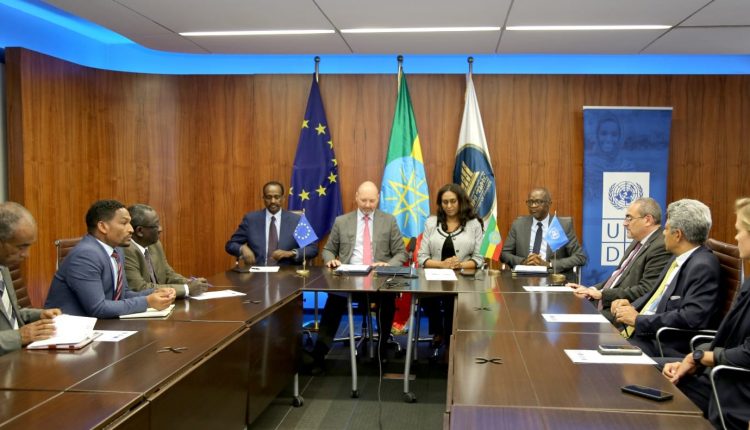 A signing ceremony took place at the Ministry of Finance on Thursday 29 February 2024 in the presence of State Minister for Finance, Semerta Sewasew, NRC Commissioner Ambassador Teshome Toga, Roland Kobia Ambassador of the European Union to Ethiopia, Dr Ramez Alakbarov, UN Resident and Humanitarian Coordinator for Ethiopia and Samuel Doe, Resident Representative, UNDP-Ethiopia.