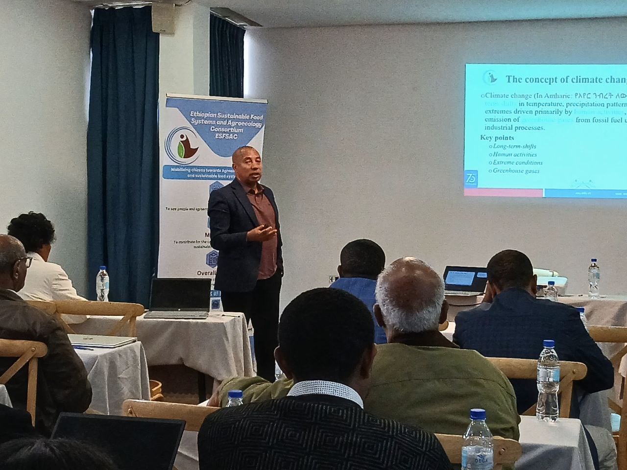Dr. Bayush Tsegaye, Executive Director of ESFSAC, praised recent national agricultural policies and advocated for agroecology as a key strategy to enhance climate resilience, food security, and nutrition.