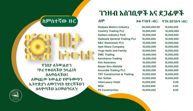 Contributors include Redawa Motors Industry, Country Trading PLC, Eastern Industry Park, Hudeyeb General Trading PLC, B&C Aluminum PLC, Ayat Share Company, Yirga Haile and Family, DMC Trading, Kerchanse Trading, Kim Kwanwoo, Beyan Ibro Abdulla, Nur Sultan, Accordia Trading PLC, and TNT Construction & Trading each donated 10 million Birr. Whereas, Inter Luxury Hotel, MSA, and FE Construction are also among the organizations that pledged to contribute to the cause.