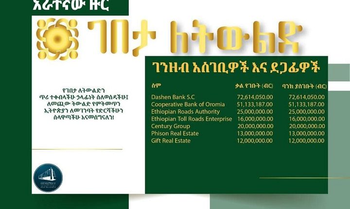 Accordingly, Dashen Bank, Oromia Cooperative Bank, Ethiopian Road Authority and Ethiopian Toll Roads Enterprise have contributed a total of 164million birr for the national grand initiative.