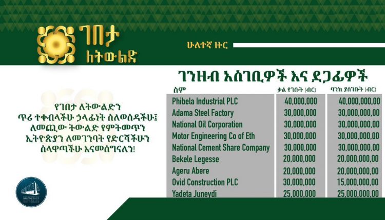 Accordingly, Fibela Industrial, Adama Steel Factory, National Oil Corporation, Motor Engineering Corporation of Ethiopia, National Cement Share Company, Bekele Legesse, Ageru Abere, Ovid Construction Plc and Yadeta Juneidi Bekri have contributed a total of 240 million birr for the national grand initiative.