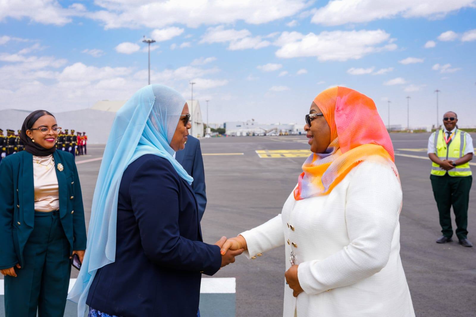 Upon arrival at Bole International Airport, President Hassan was warmly received by Ethiopia’s Minister of Labor and Skills, Muferiat Kamil, and State Minister for Foreign Affairs, Ambassador Berhanu Tsegaye.