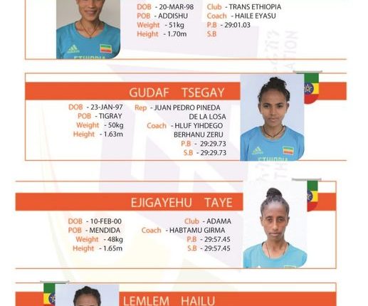 ኣብቲ ውድድር፥ ኣትሌት ለተሰንበት ግደይ፣ ጉዳፍ ፀጋይ፣ እጅጋየሁ ታዬን ለምለም ሃይሉን ኢትዮጵያ ዝውክላ ኢየን።
