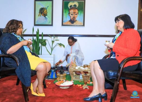 ሚኒስትር ዴኤታ ሚኒስቴር ጉዳያት ወፃኢ ፌዴሪኢ ኣምባሳደር ብርቱካን ኣያኖ ምስ ፍሊይቲ ልኡኽ ሚኒስትር ጉዳያት ወፃኢ ስሎቬኒያ ሬናታ ቬልባር ዘቲየን።