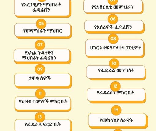 ትካላት ሃይማኖት፣ ኮንፌዴሬሽን ማሕበር ሰራሕተኛታት፣ ፌዴሬሽን ማሕበር ኣረጋውያን፣ መምህራን፣ ማሕበር መምህራን ላዕለዎት ትካላት ትምህርቲ (ዩኒቨርሲቲ)፣ ፌዴሬሽን መስራሕቲ፣ ፌዴሬሽን ማሕበር ጉዱኣት ኣካል፣ ሃገር ለኸ ፓርቲታት ፖለቲካን ፍሉጣት ሰባትን ክሳተፋ ኢዮም።