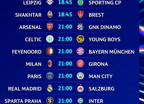 በተመሳሳሊ ሰዓት ምሸት ሰዓት 5 ኣርሰናል ምስ ዳይናሞ ዛግሬብ፣ ኤሲ ሚላን ምስ ዢሮና፣ ሴልቲክ ምስ ያንግ ቦይስ፣ ፌይኖርድ ምስ ባየርንሙኒክ፣ ሪያል ማድሪድ ምስ ሬድ ቡል ሳልዝበርግ ከምኡ እውን ስፓርታ ፕራግ ምስ ኢንተር ሚላን ፀወተአን ከካይዳ ኢየን፡፡